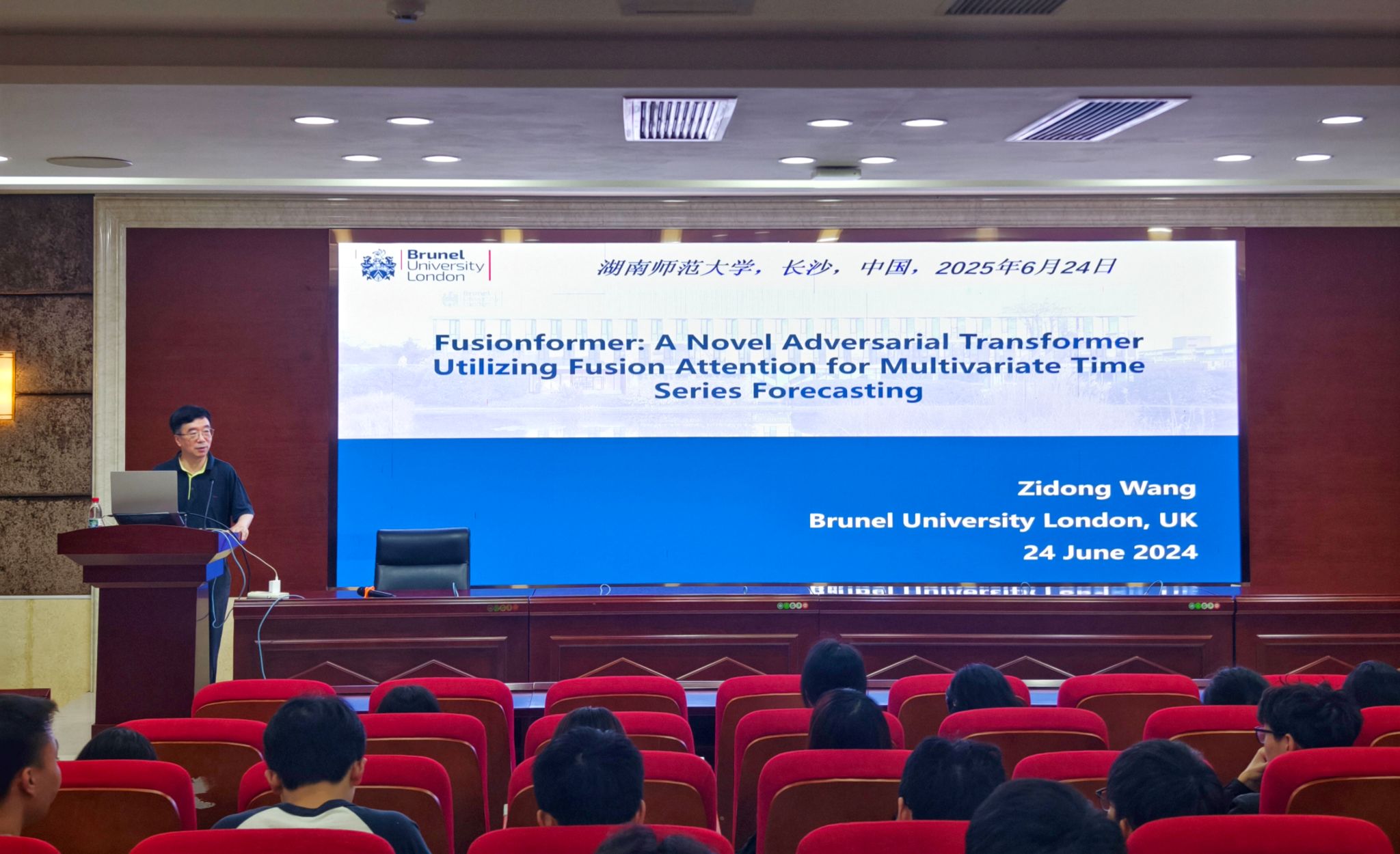 6月24日上午,应湖南师范大学信息科学与工程学院、智能计算与语言信息处理湖南省重点实验室邀请,欧洲科学院院士,欧洲科学与艺术院院士,王子栋教授进行了主题为“Adversarial Transformer for Multivariate Time Series Forecasting”的学术报告,本次报告由信息科学与工程学院肖林副院长主持,科研办组织召开,2024级研究生及相关老师参加。